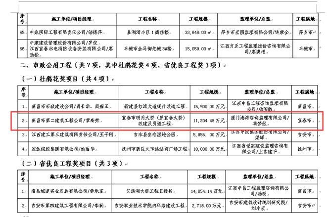 由南昌市第二建筑工程公司承建的江西旺旺新建廠房1#車間工程獲“2015年度江西省優(yōu)良工程獎(jiǎng)”,宜春市明月大橋(原宜春大橋)改建及引道工程榮獲“2015年度江西省杜鵑花獎(jiǎng)”[摘自江西省住房和城鄉(xiāng)建設(shè)廳文件贛建質(zhì)字[2016]5號]。