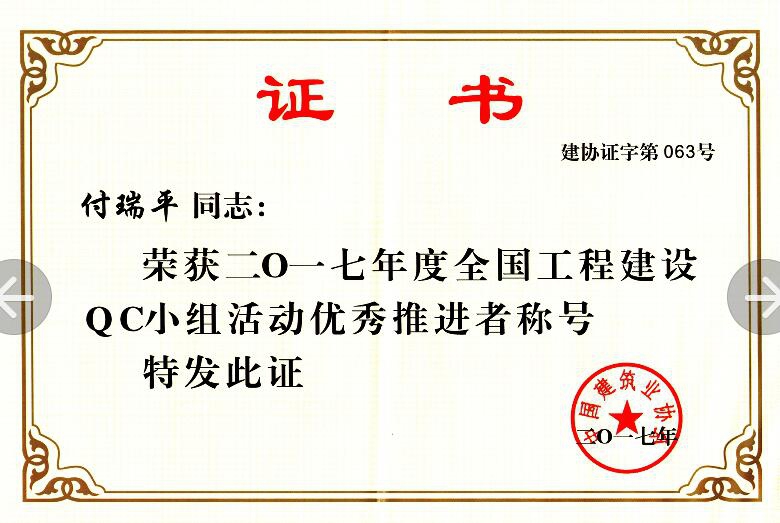 在中國(guó)建筑業(yè)協(xié)會(huì)組織的2017年度QC成果發(fā)布會(huì)上,公司QC小組的《提高GC發(fā)泡水泥保溫板外墻外保溫施工質(zhì)量》成果榮獲2017年度全國(guó)工程建設(shè)質(zhì)量管理小組活動(dòng)優(yōu)秀成果獎(jiǎng);付瑞平同志榮獲2017年度全國(guó)工程建設(shè)QC小組活動(dòng)優(yōu)秀推進(jìn)者稱(chēng)號(hào)。
